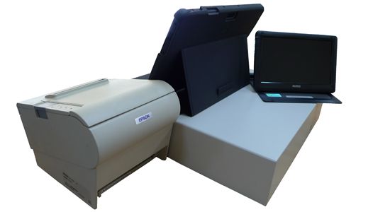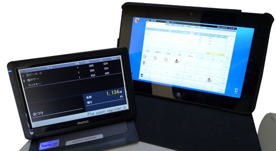 左の写真は「タブレット型コンピュータ」「7インチのモニタ(お客さん側に向ける画面)」「レシートプリンタ」「キャッシュドロワー(金庫)」のシンプル構成です