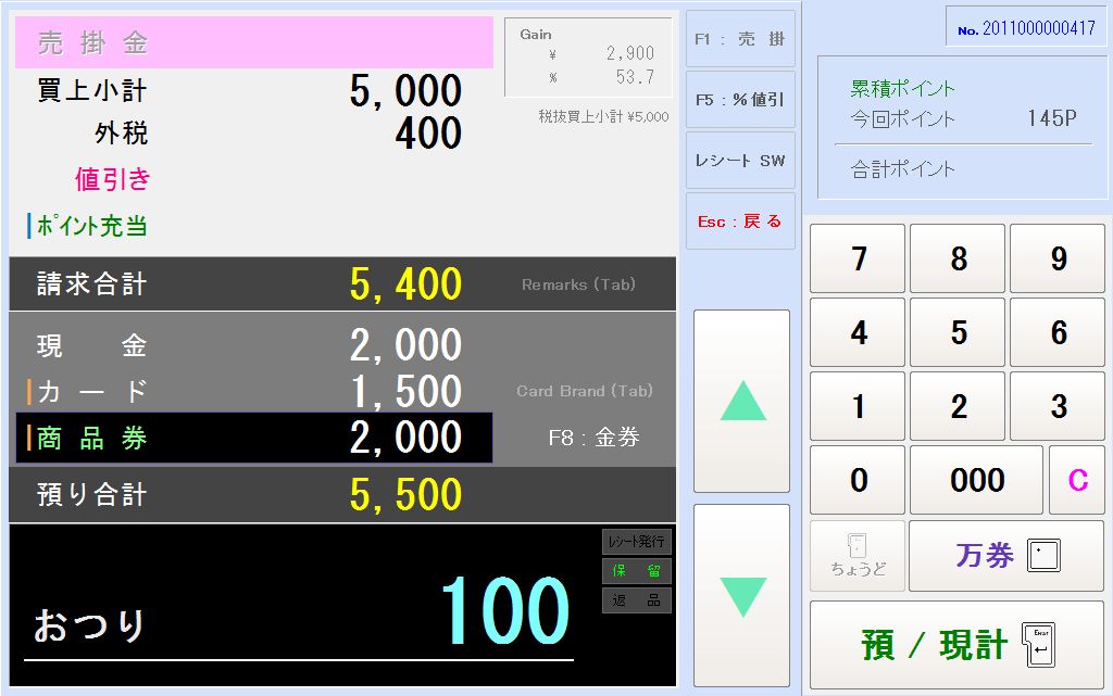 会計画面もシンプルですが、現金・カード・商品券などの複合会計が簡単にてきます。