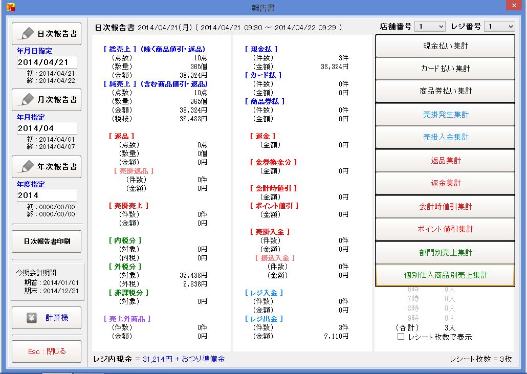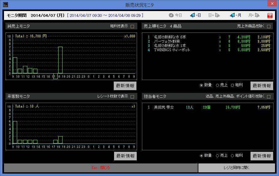 簡易ですが「時間単位の売上」「商品単位の売上」「来客数」「レジ担当者別の集計」が見られます