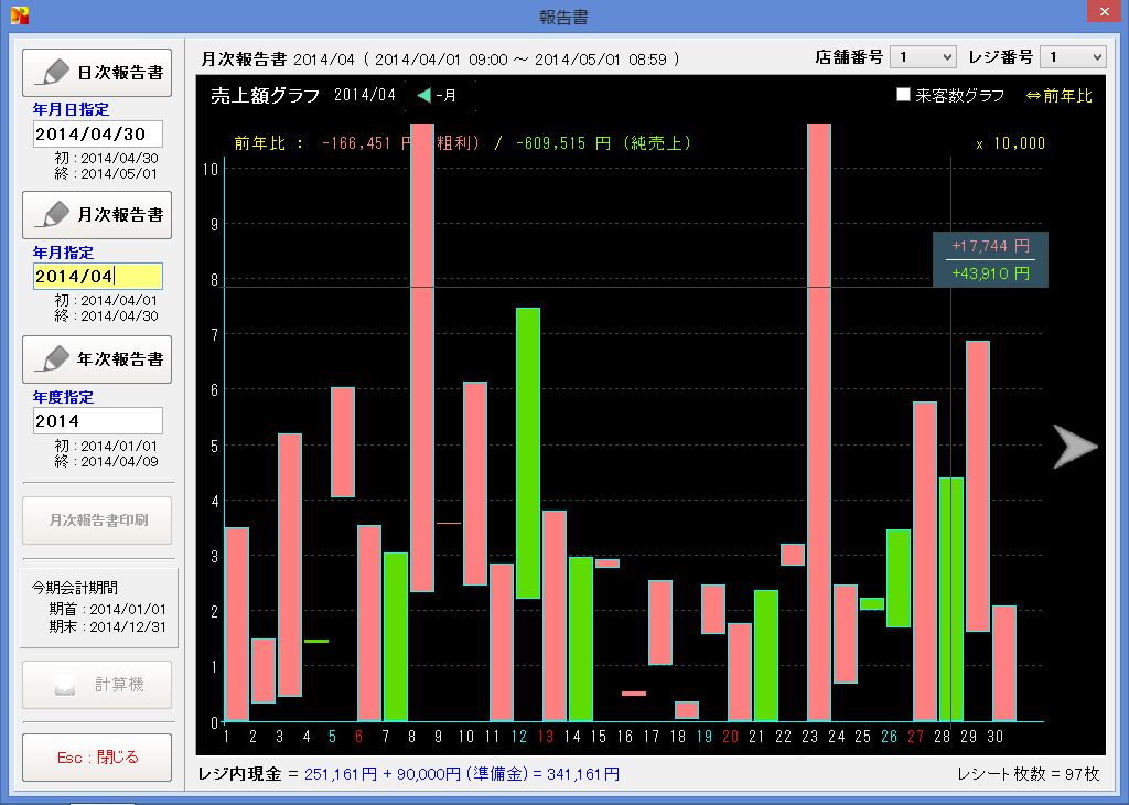 推移をグラフで見られる他、前年比も色付きのグラフで一目瞭然