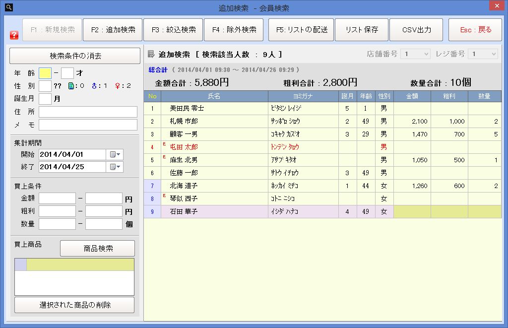 「住んでいる地域」や「買った商品」「買った金額」「いつからいつまでの間に1万円以上買った人」など複合的な条件で顧客リストを作成できます